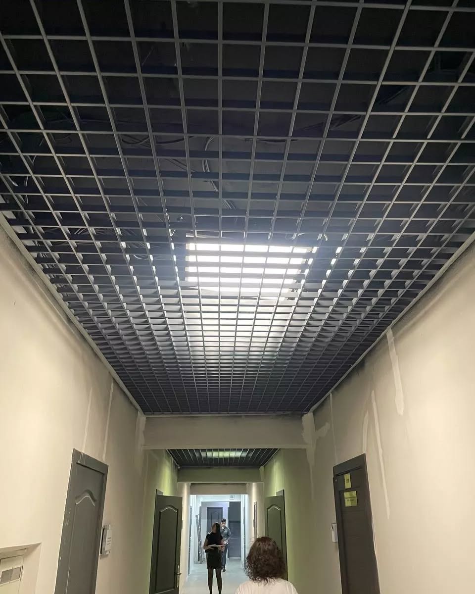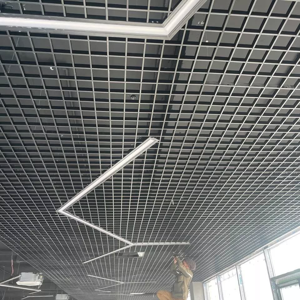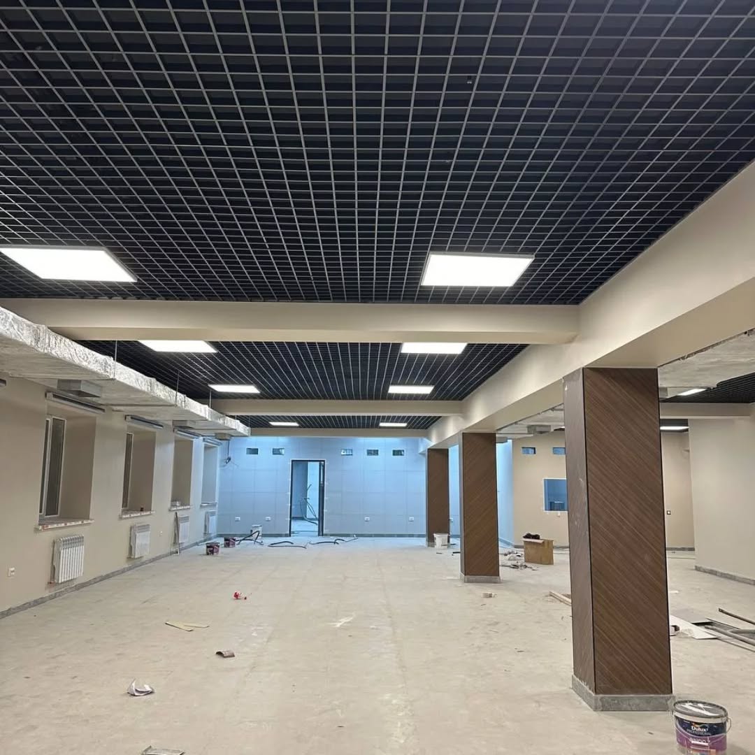 Монтаж современных решетчатых потолков Грильято для торговых центров, бизнес-центров и общественных пространств